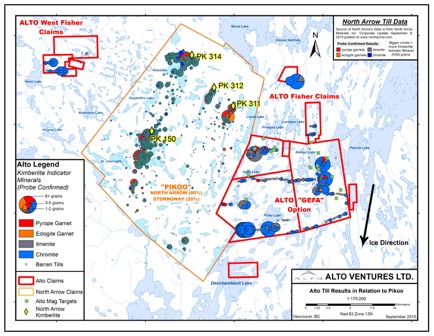 Figure 1 Alto Ventures claims are outlined in red with KIM trains and aeromagnetic anomalies shown from Alto's 2014 and 2015 programs. North Arrow Minerals claims are outlined in orange with diamondiferous kimberlites discovered to date by drilling highlighted in yellow. Note PK346 was discovered in 2016 and is located near PK314.