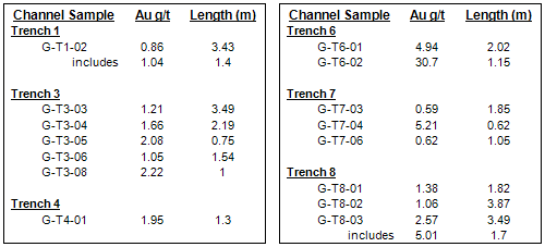 - 2009 channel samples up to 30.7 g/t Au over 1.15 m